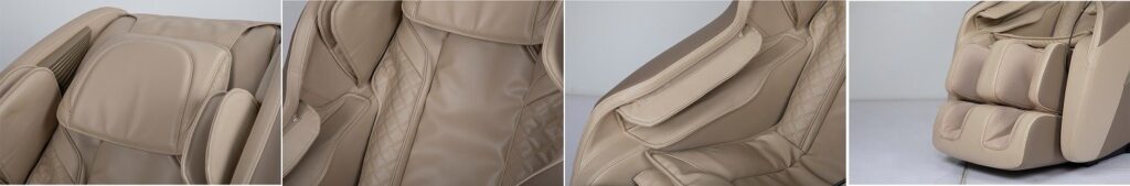 Visokokvalitetna, lijepo dizajnirana, izdržljiva tekstilna koža (PU) i poliamid, PVC, čelik, električne i elektroničke komponente. Tekstura tekstilne kože (PU), prekrasan dizajn. Visokoelastični jastuk, izrađen ekološkom tehnologijom, pamuk smanjenog pritiska, “čarobni” koji je mekan i prianja uz kožu. Prozračni materijal koji odbija vlagu i grinje. Uzimajući u obzir aspekte zaštite okoliša, udobna masažna stolica izrađena je od ekološke tekstilne kože s vlaknima, koja je mekana na dodir, otporna na habanje i lomljenje, otporna na pritisak. Testirana 200.000 puta, bez pucanja.