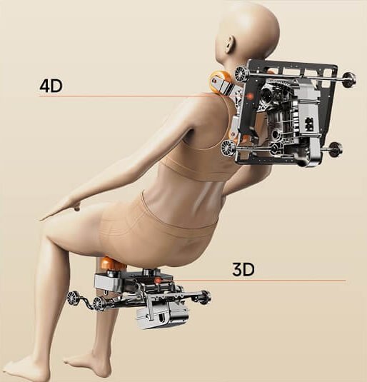 - U usporedbi s 4D, 4D+ nudi “razinu više”, dok su 3D modeli još “razine niže”. Kod nekih 2D/3D fotelja jačina masaže valjaka nije ručno podesiva, već se regulira nagibom i jastučićima.